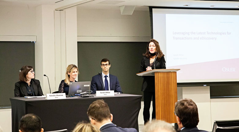 The Osler Works seminar gave clients insight as to how the firm’s in-house Osler Works platforms — which leverage technology to deliver a streamlined set of due diligence and closing-related services — function. The firm’s Osler Works — Transactional and Osler Works — Discovery teams have been actively using automated document review and machine learning tools in their practices, and these offerings are some of the best examples of how Osler has been solving clients’ problems through the application of technology. Osler partner Sarah Millar, head of Osler Works — Discovery (a service that streamlines discovery and document review requirements), and Natalie Munroe, head of Osler Works — Transactional (a service that streamlines transaction-related matters including due diligence, contract analysis and closings), explained during their seminar at the Expo how understanding the application of these tools to streamline legal workflow — and in turn lower legal costs — is important. But they also stressed that these technologies are not meant to replace, but complement the work done by legal professionals.