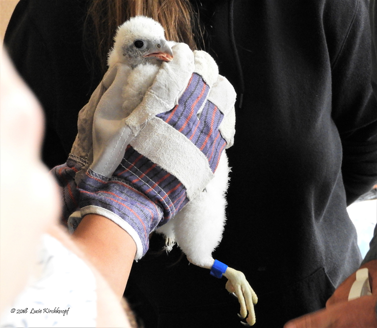 The banding process, which helps keep track of growth of the at-risk species, involves weighing the falcons and banding their legs with bracelets in order to monitor their movements and health. Peregrine falcons have been nesting on the Sheraton roof for 20 years.