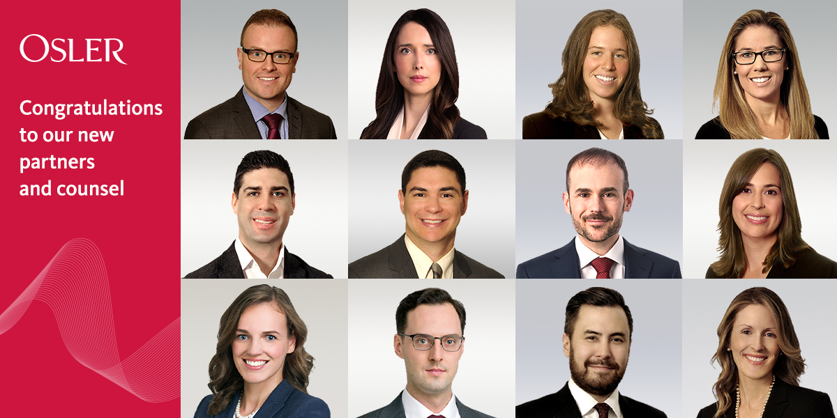 Osler is proud to announce the addition of 11 new partners and one new counsel across three of our offices, effective March 1.