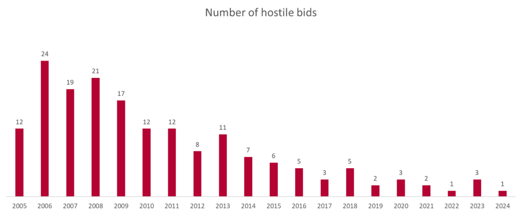 Note: Includes all hostile bids that targeted Canadian-listed public companies from January 1, 2005, to December 16, 2024. Data prior to 2017 drawn from Kingsdale Advisors.