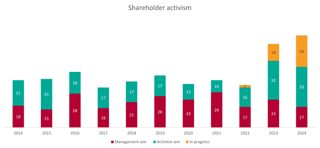 The data in the chart only captures publicly disclosed instances of shareholder activism and therefore does not include “behind the scenes” instances where there may have been changes in board composition and other measures as a result of private discussions and negotiated outcomes between issuers and activist shareholders.
