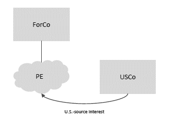 Take, for example, a treaty-eligible company resident outside the United States (ForCo) that sets up a PE in a third country that receives interest payments from a U.S. corporation (USCo).