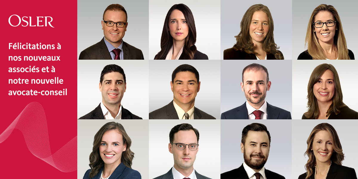 « Félicitations à nos nouveaux associés et à notre nouvelle avocate-conseil, a dit l’associé directeur national d’Osler Doug Bryce. Nous sommes heureux d’accueillir une cohorte aussi talentueuse de nouveaux associés et nous sommes convaincus qu’ils joueront un rôle de premier plan dans l’essor de nos activités et de notre cabinet au cours de nombreuses années à venir. »